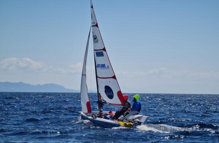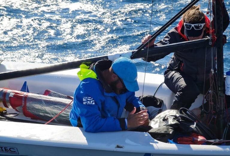 Naša neutrudljiva jadralca sta pravkar prečkala nov mejnik, za njima je namreč že 100 navtičnih milj! Za to razdaljo sta potrebovala 18 ur in 40 minut, njuna povprečna hitrost pa je bila 5,3 vozla. Najvišja dosežena hitrost je znašala kar okrog 12 vozlov, kar je za tako majhno barko in glede na razmere na vodi zelo lep dosežek.