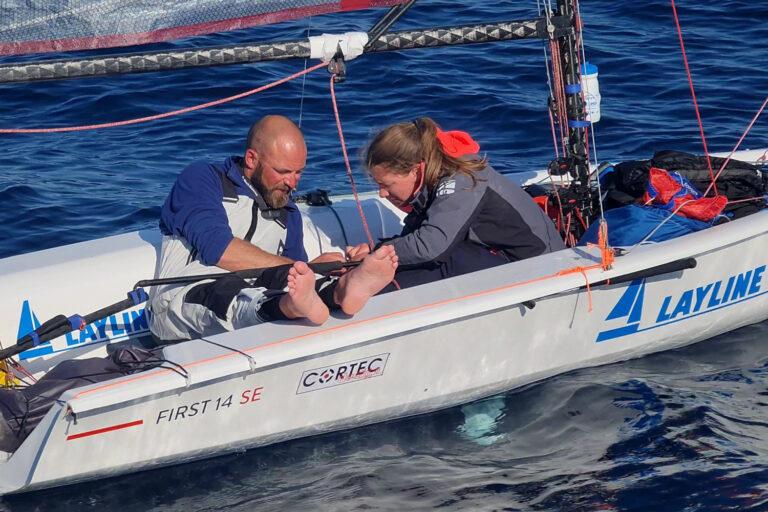 Po adrenalinski vožnji z vetrom se je izpulilo vpetje stranske pripone, zaradi česar je padel jambor. Oba sta cela, zdrava in suha. Do kontakta s podporno ekipo ni prišlo. Jambor in jadra so brez poškodb. Z improvizirano ojačitvijo sta uspela na novo postaviti jambor. Trenutno plujeta samo na sprednje jadro, do zaliva, kjer bosta v zaveterju ocenila kvaliteto svojega popravila.